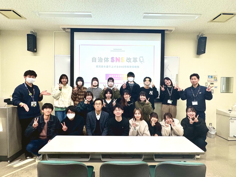 その一環として、鹿児島局チーム(鹿児島地域振興局、鹿児島市、日置市)は「鹿児島地域の持続可能な未来を創る-地域活性化のバズる!情報発信戦略-」をテーマに設定し、調査を行っており、自治体政策論ゼミ(崎野ゼミ)は、令和8年1月20日、鹿児島局チームが開催したワークショップに参加しました。