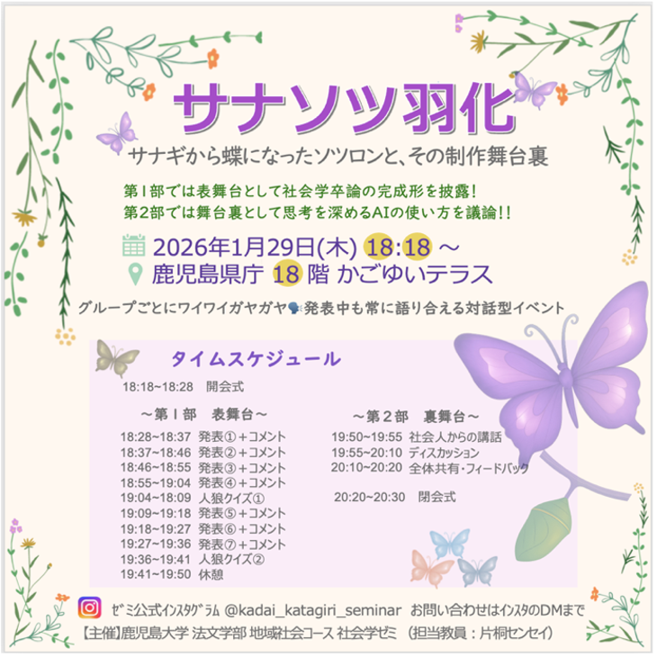 2026年1月29日(木)18時18分より、鹿児島大学社会学ゼミは「サナソツ羽化」を開催しました。7人の4年生(うち1人は体調不良で不参加)が完成した卒業論文を発表し、Teamsによるオンライン配信も行いました。4人ずつ7テーブルに分かれて着席しました。2025年7月に開催した「サナギ卒論」での中間報告を経て、サナギ卒論が羽化したことにちなんで、本イベントは「サナソツ羽化」と名付けられました。