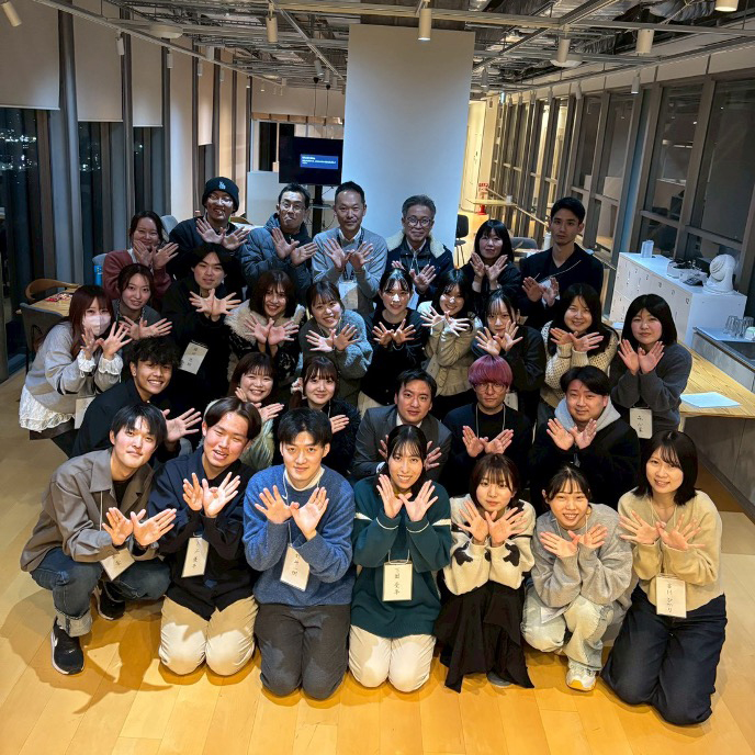 最後には、参加者全員で手を使って蝶の形をつくり記念撮影。サナギだった卒論が羽化したことを表現しました。