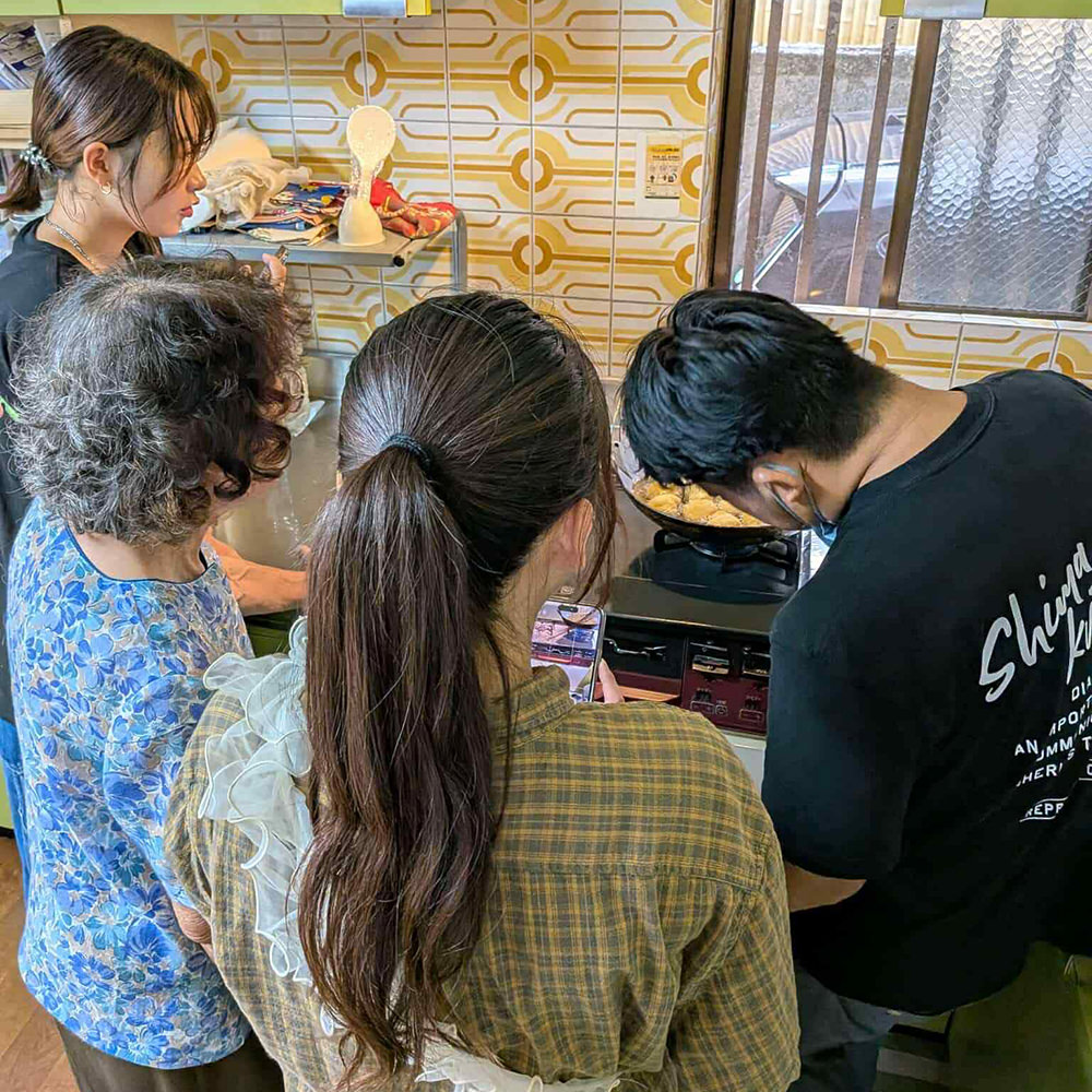 地域の料理上手な方のお宅でパン屋さんと一緒にサーターアンダギーづくりを勉強中